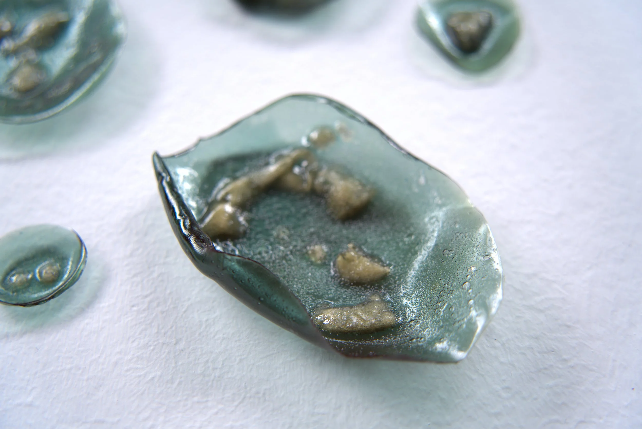 Description: Big embroidery clusters with bioplastic sculptures on natural dyed base