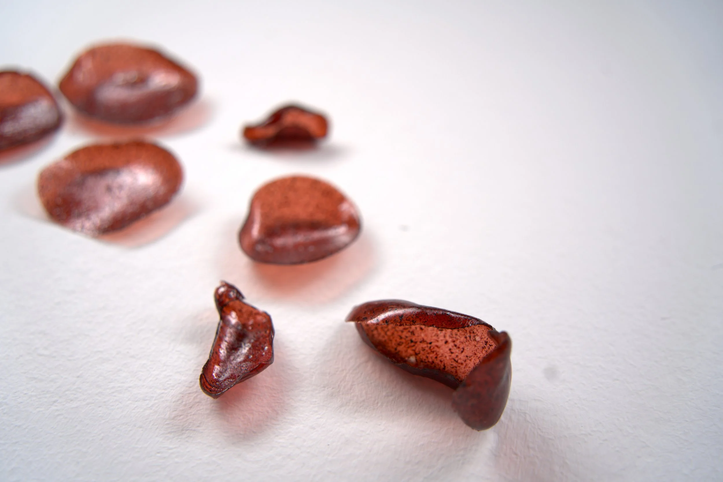 Description: Flocking with embroidery clusters, beading, and bioplastics on natural dyed base